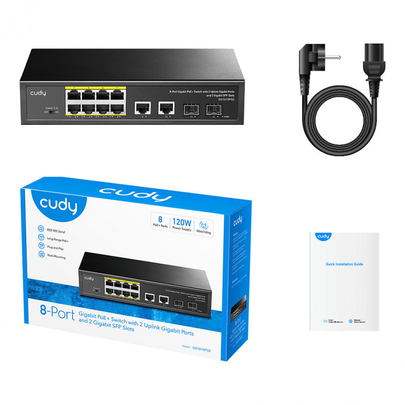 "Cudy GS1010PS2. Switch type: Unmanaged. Basic switching RJ-45 Ethernet ports type: Gigabit Ethernet (10/100/1000), Basic switching RJ-45 Ethernet ports quantity: 10. MAC address table: 2048 entries, Switching capacity: 24 Gbit/s. Networking standards: IEEE 802.3ab, IEEE 802.3af, IEEE 802.3at, IEEE 802.3i, IEEE 802.3u, IEEE 802.3x, IEEE 802.3z. Power over Ethernet (PoE). Rack mounting"\n"A rack-mounted Gigabit PoE switch with a 120W power supply and a silent cooling system.