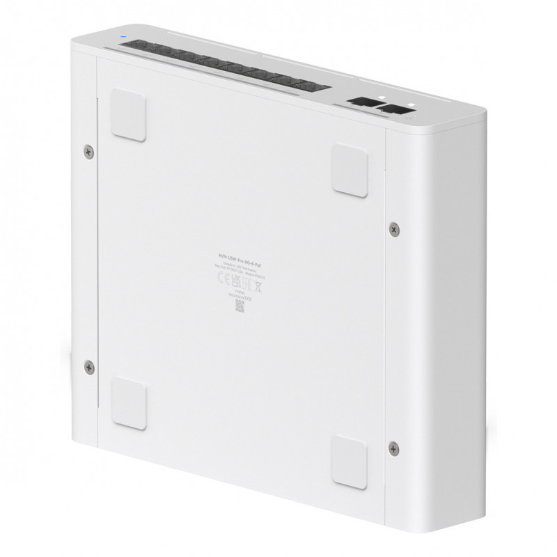 "Ubiquiti UniFi Pro XG 8 PoE. Switch type: Managed, Switch layer: L2/L3. Basic switching RJ-45 Ethernet ports type: 10G Ethernet (100/1000/10000), Basic switching RJ-45 Ethernet ports quantity: 8. MAC address table: 32000 entries, Switching capacity: 200 Gbit/s. Power connector: DC-in jack. Power over Ethernet (PoE). Wall mountable"\n"Compact desktop/wall-mountable, professional-grade 8-port, Layer 3 Etherlighting™ PoE++ switch with (8) 10 GbE and (2) 10G SFP+ ports."