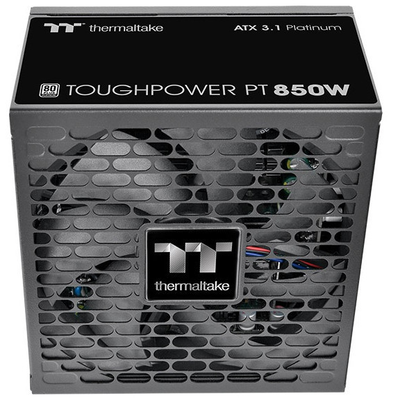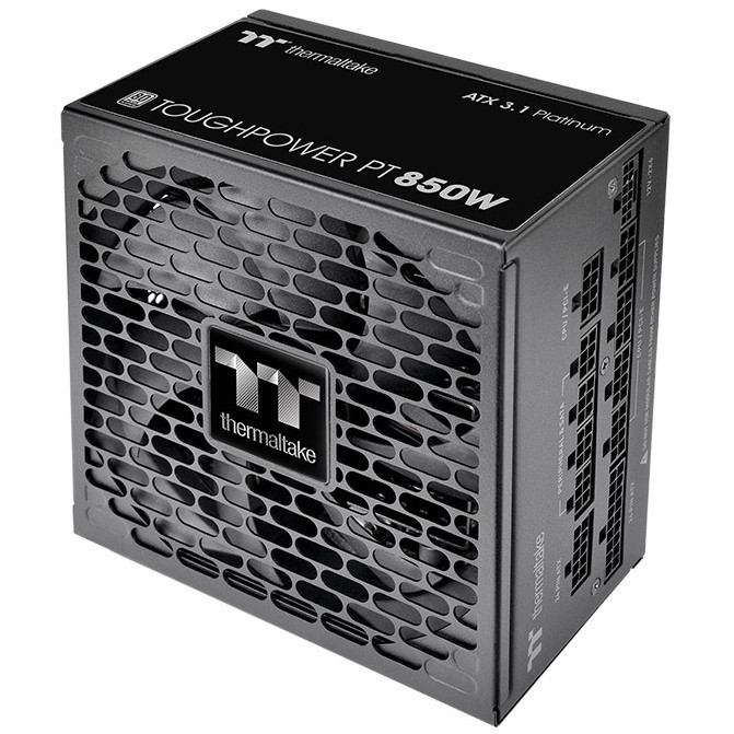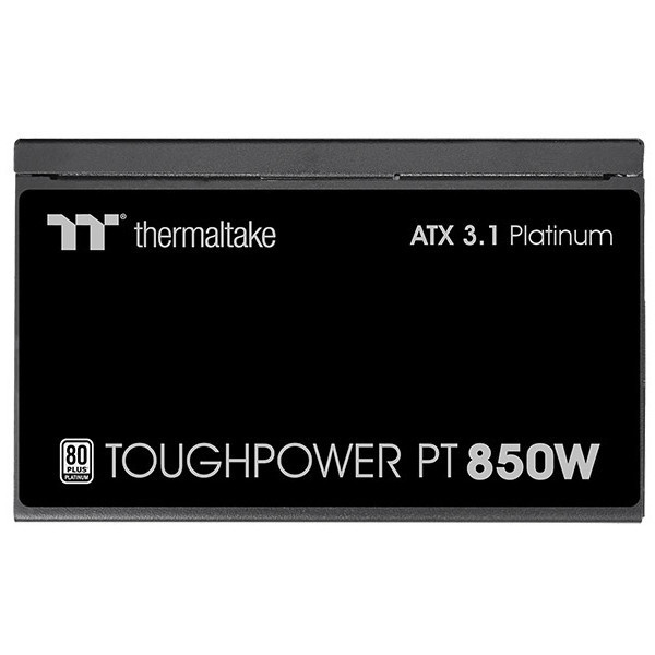 "Thermaltake Toughpower PT 850W. Total power: 850 W, AC input voltage: 100 - 240 V, AC input frequency: 47 - 63 Hz. Motherboard power connector: 24-pin ATX, Motherboard power cable length: 55 cm, SATA power cable length: 450,600,750 mm. Purpose: PC, Power supply unit (PSU) form factor: ATX, 80 PLUS certification: 80 PLUS Platinum. Product colour: Black, Cooling type: Active, Fan diameter: 13.5 cm. Safety: CE/UKCA/FCC/ICES/CB/TUV/cTUVus/LVD/CCC/BSMI/ S-MARK/EAC/RCM"\n"The Toughpower PT 850W Platinum is ATX 3.1 compatible, 80 PLUS Platinum certified, and supports native PCIe Gen 5.1 (12+4pin) for next-gen GPU power. Delivers 850W continuous output at 40°C.