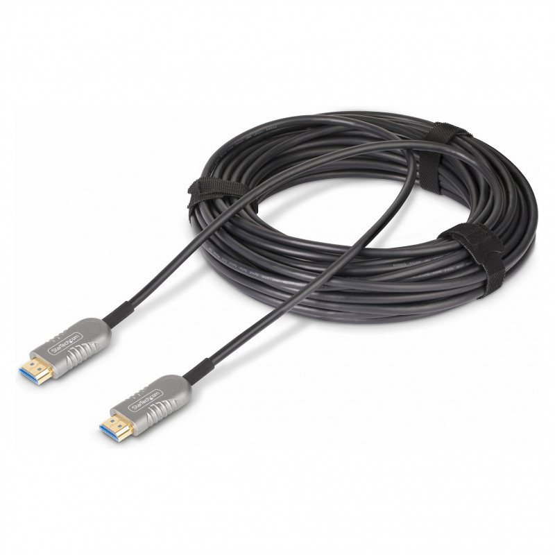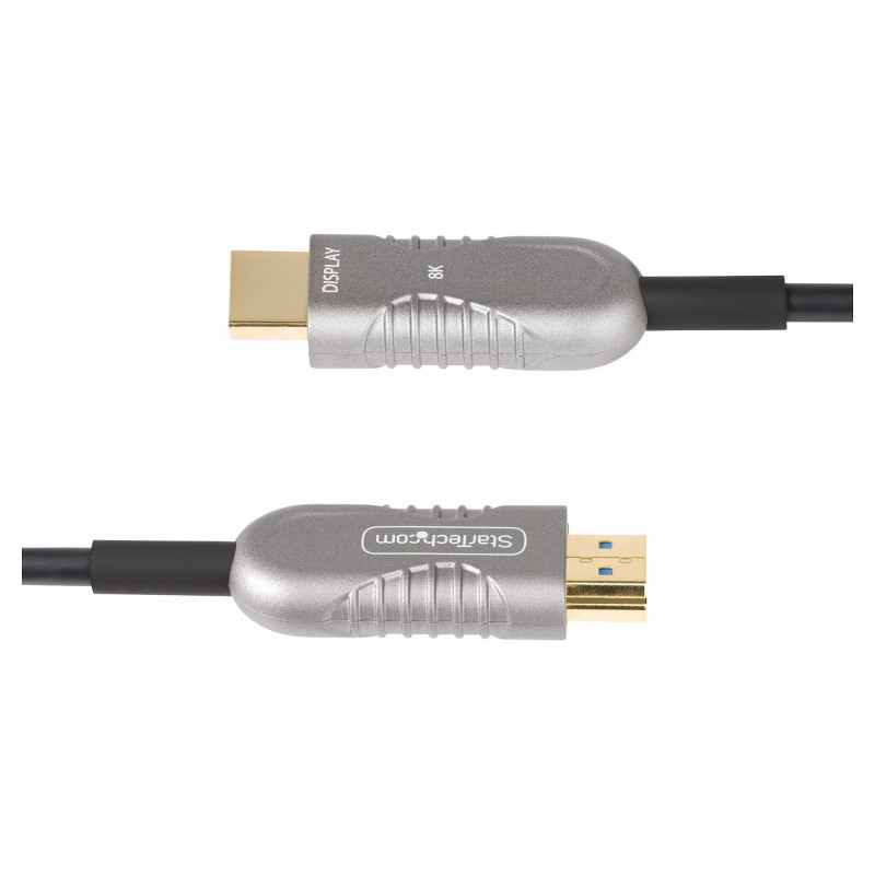 "StarTech.com 100ft (30.4m) HDMI 2.1 Hybrid Active Optical Cable (AOC), CMP, Plenum Rated, 8K Ultra High Speed HDMI 2.1/2.0 Fiber Optic Cable, 48Gbps, 8K 60Hz/4K 120Hz, HDR10+/FRL/TMDS/eARC. Cable length: 30.4 m, Connector 1: HDMI Type A (Standard), Connector 1 gender: Male, Connector 2: HDMI Type A (Standard), Connector 2 gender: Male, Connector contacts plating: Gold, Data transfer rate: 48 Gbit/s, Audio Return Channel (ARC), Product colour: Black, Silver"\n"Reliably connect high-bandwidth HDMI 2.1 devices through plenum spaces