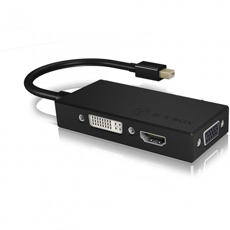 "ICY BOX IB-AC1032. Connector 1: Mini DisplayPort, Connector 2: DVI-D + VGA (D-Sub) + HDMI, Connector 1 gender: Male. Weight: 46 g, Width: 87 mm, Depth: 40 mm. Package width: 200 mm, Package depth: 100 mm, Package height: 25 mm. Quantity per pack: 1 pc(s). Master (outer) case width: 440 mm, Master (outer) case length: 400 mm, Master (outer) case height: 235 mm"\n"Versatile