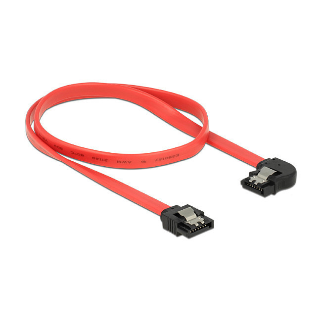 "DeLOCK 83964. Cable length: 0.5 m, Connector 1: SATA 7-pin, Connector 2: SATA 7-pin. Package type: Polybag"\n"This SATA cable by Delock enables the internal connection of various SATA devices, e.g. HDDs, controller cards or Flash memories. It complies with the latest standard and provides a data transfer rate of up to 6 Gb/s. It is downwards compatible to the previous SATA versions, but can then only reach the respective transfer speed. When connecting this cable to a HDD the cable will be lead to the left. The metal clips on the connectors ensure that the cable reliably clicks into place."