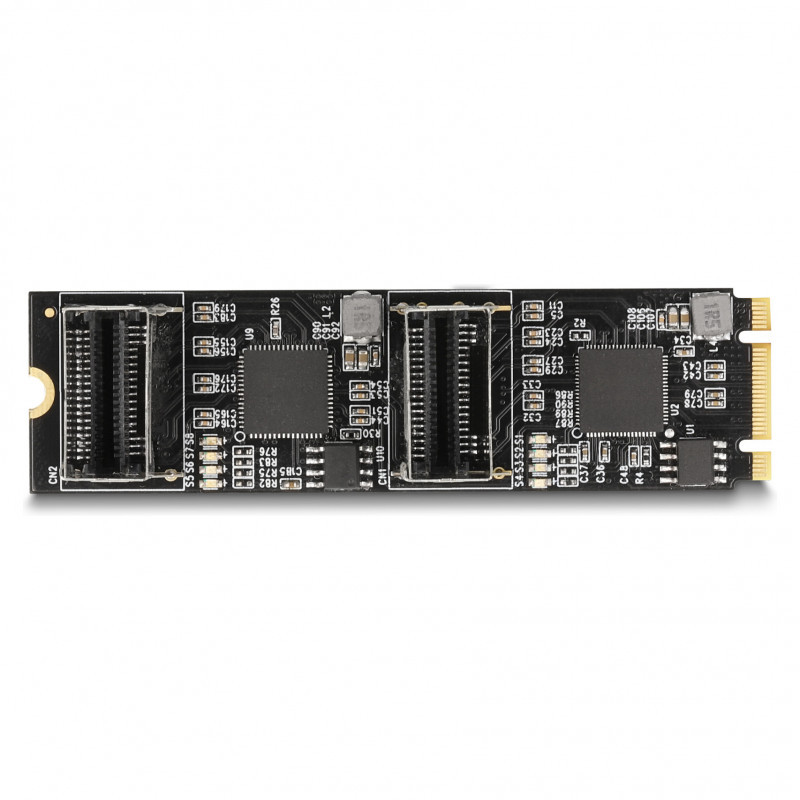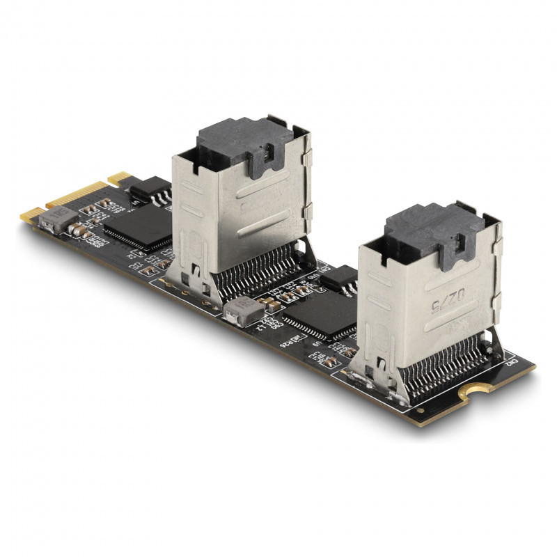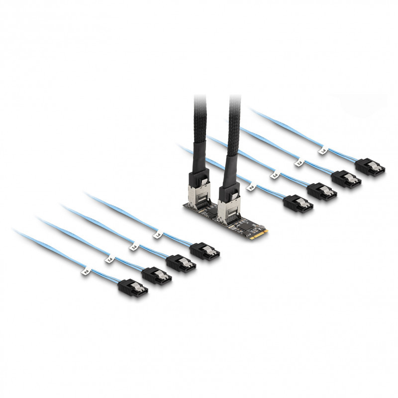 "DeLOCK Converter M.2 2280 Key B+M male to 8 x SATA. Host interface: M.2, Output interface: SATA, Host interface gender: Male. LED indicators: Access, Power, Country of origin: China. Chipset: JMicron JMB585/JMB575, Connector 1 gender: Male, Connector 2 gender: Female. Windows operating systems supported: Windows 10, Windows 11, Windows 8.1, Linux operating systems supported: Linux Kernel 5.13, Linux Kernel 5.14, Linux Kernel 5.15, Server operating systems supported: Windows Server 2019. Width: 22 mm, Depth: 80 mm, Height: 21 mm"\n"This converter by Delock expands the system by 8 SATA ports. Different devices such as SSDs, hard drives, DVD-drives etc. can be connected to the converter."