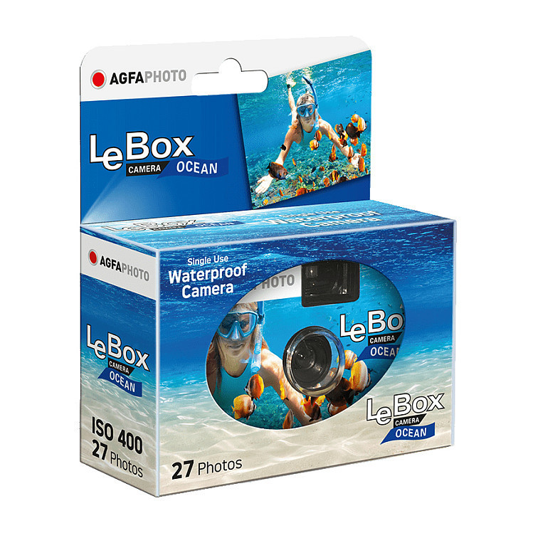 The LeBox Ocean disposable camera enables you to easily take 27 colour photos while still holding on to the charm and fun of film. Its 28 mm lens and its 400 ISO integrated film roll makes it super easy to take photos both indoors and outdoors, giving you an authentic photo print that will you will be thrilled with. You can even take it underwater up to a depth of 5 metres. Perfect for hassle-free holiday memories!