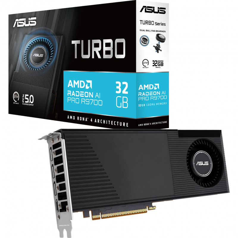 "ASUS Turbo -AI-PRO-R9700-32G. Graphics processor family: AMD, Graphics processor: Radeon AI PRO R9700. Discrete graphics card memory: 32 GB, Graphics card memory type: GDDR6, Memory bus: 256 bit. Maximum resolution: 7680 x 4320 pixels. OpenGL version: 4.6. Interface type: PCI Express 5.0. Cooling type: Active, Number of fans: 1 fan(s)"\n"ASUS Turbo Radeon™ AI Pro R9700