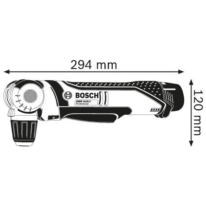 "Bosch 0601390909. Product design: Right-angle drill, Chuck type: Keyless, Product colour: Blue. Chuck capacity (max): 1 cm, Drilling diameter in wood (max): 1 cm, Idle speed (1st gear): 1300 RPM. Power source: Battery, Battery technology: Lithium-Ion (Li-Ion), Battery voltage: 12 V. Weight: 1.2 kg"\n"- Motor brake for precise work when driving rows of screws
