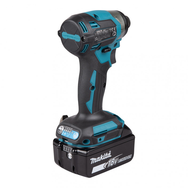"Makita DTD173RTJ. Product type: Impact driver, Handle shape: Pistol handle, Chuck diameter: 1/4"". Idle speed (max): 3600 RPM, Idle speed (min): 1100 RPM, Torque (min): 20 N⋅m. Power source: Battery, Battery voltage: 18 V, Battery technology: Lithium-Ion (Li-Ion). Width: 81 mm, Depth: 111 mm, Height: 234 mm"\n