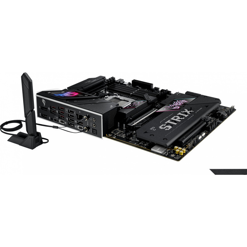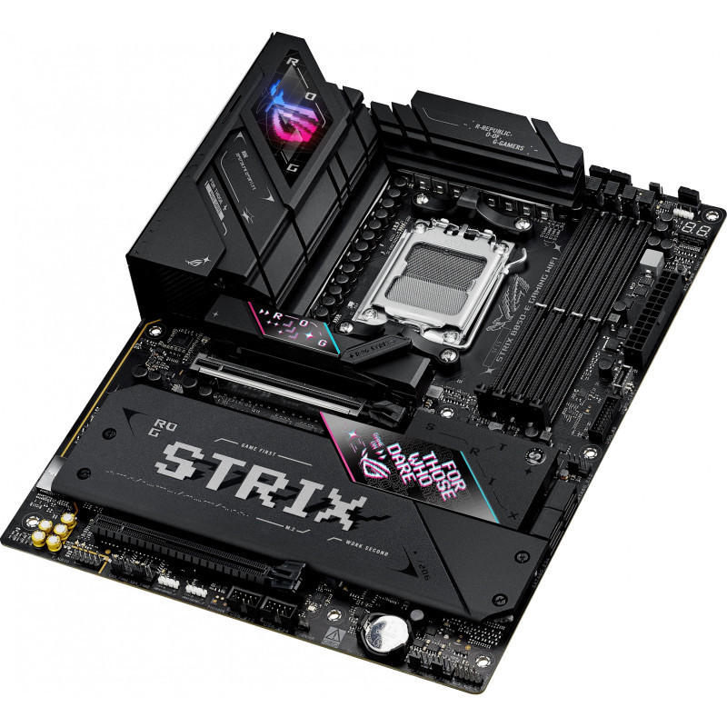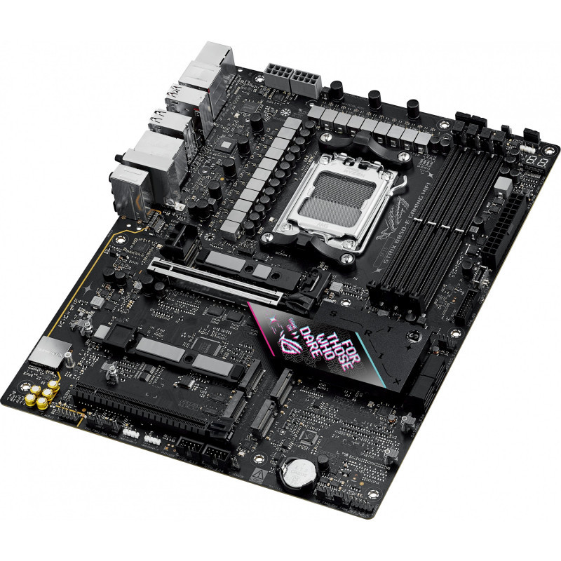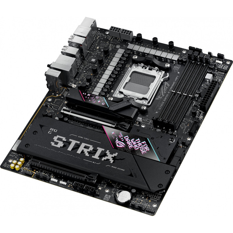 "ASUS ROG STRIX B850-E GAMING WIFI. Processor manufacturer: AMD, Processor socket: Socket AM5, Compatible processor series: AMD Ryzen 7000 Series, AMD Ryzen 8000 Series, AMD Ryzen 9000 Series. Supported memory types: DDR5-SDRAM, Maximum internal memory: 192 GB, Memory slots type: DIMM. Supported storage drive interfaces: M.2, SATA III, Supported storage drive types: HDD & SSD, RAID levels: 0, 1, 5, 10. Maximum resolution: 7680 x 4320 pixels. Ethernet interface type: 5 Gigabit Ethernet, Top Wi-Fi standard: Wi-Fi 7 (802.11be), Wi-Fi standards: Wi-Fi 7 (802.11be)"\n"The ROG Strix B850-E Gaming WiFi is engineered to harness the full potential of AMD Ryzen™ 9000 Series processors. Featuring PCIe® 5.0 support, AI Overclocking, AI Networking II, and AEMP, setup is streamlined while performance is maximized. One USB4® Type-C port and WiFi 7 with Realtek 5Gb Ethernet ensure top-tier connectivity, while robust heatsinks keep M.2 drives cool under heavy loads. This motherboard not only meets the demands of gaming and professional applications but also delivers the power and connectivity essential for advanced AI PC applications.