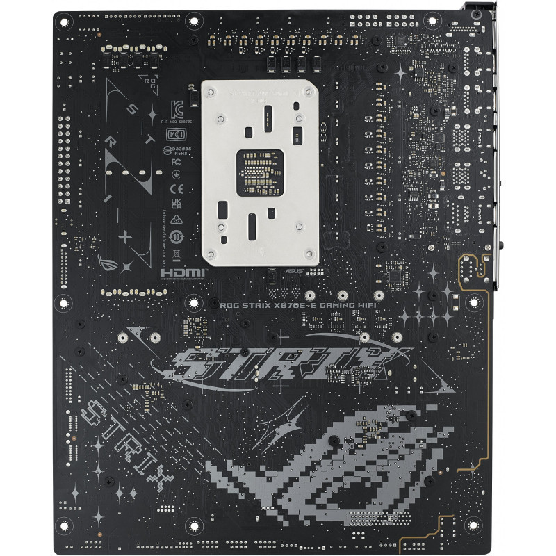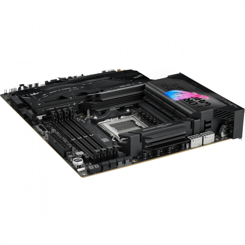 "ASUS ROG STRIX X870E-E GAMING WIFI. Processor manufacturer: AMD, Processor socket: Socket AM5, Supported processor sockets: Socket AM5. Supported memory types: DDR5-SDRAM, Maximum internal memory: 192 GB, Memory slots type: DIMM. Supported storage drive interfaces: M.2, SATA III, Supported storage drive types: HDD & SSD, RAID levels: 0, 1, 10, 5. Ethernet interface type: 5 Gigabit Ethernet, Top Wi-Fi standard: Wi-Fi 7 (802.11be), Wi-Fi standards: Wi-Fi 7 (802.11be). Component for: PC, Motherboard form factor: ATX, Motherboard chipset family: AMD"\n"ASUS AI INTELLIGENCE