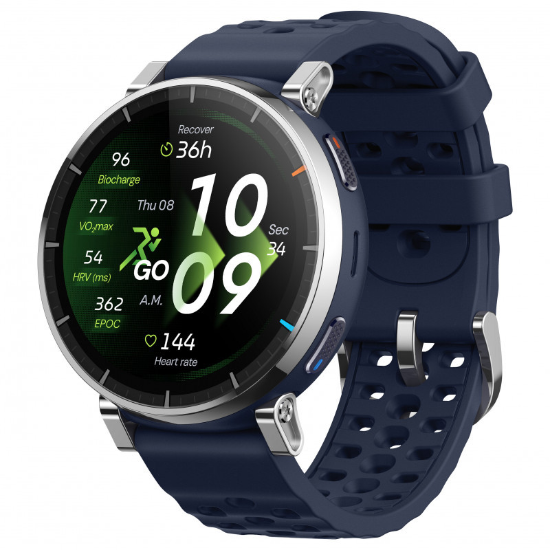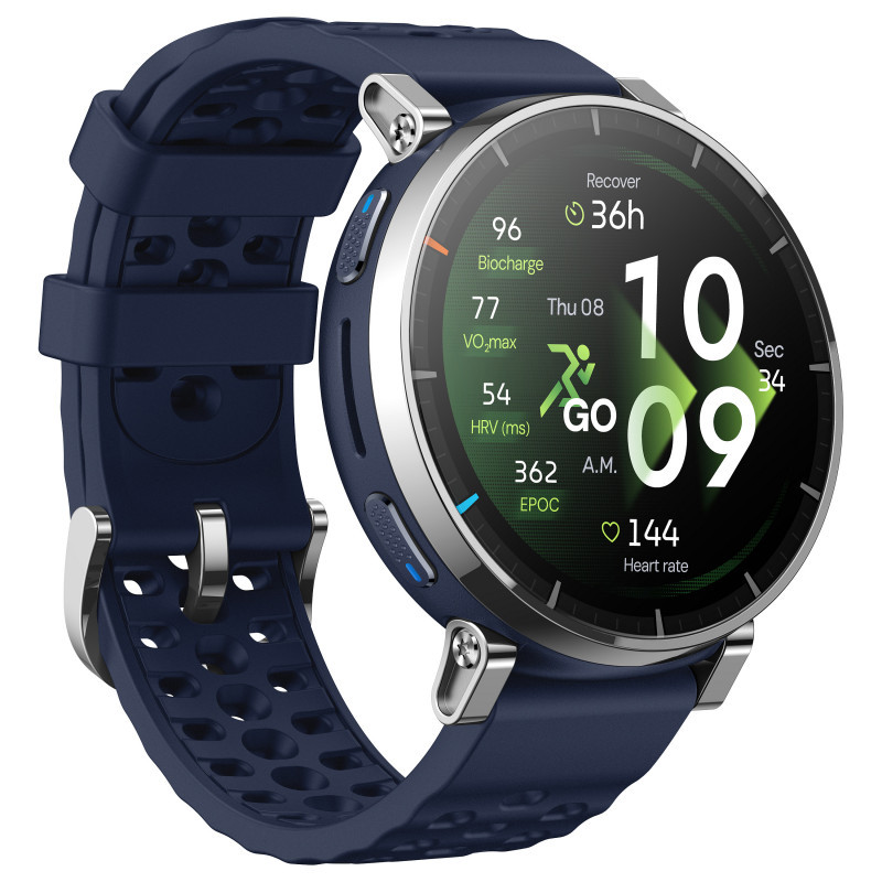 "Amazfit W2558GL2N. Display diagonal: 3.35 cm (1.32""), Display technology: AMOLED, Display resolution: 466 x 466 pixels, Touchscreen. GPS (satellite). Battery capacity: 365 mAh. Weight: 38 g. Band material: Silicone, Band colour: Blue"\n