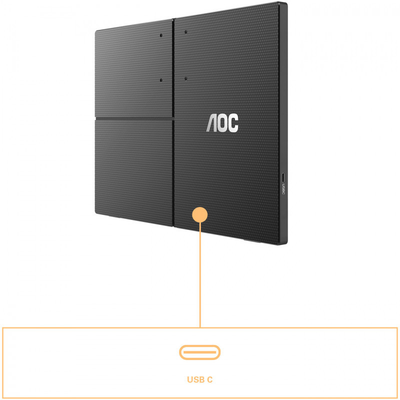 "AOC 16T3EA. Display diagonal: 39.6 cm (15.6""), Display resolution: 1920 x 1080 pixels, HD type: Full HD. USB port type: USB Type-C, USB version: 3.2 Gen 1 (3.1 Gen 1), Headphone connectivity: 3.5 mm. Product colour: Black, Panel mounting interface: 50 x 50 mm, Tilt angle range: 5 - 25°. On Screen Display (OSD) languages: Simplified Chinese, Traditional Chinese, Czech, Dutch, English, Finnish, French, German, Italian,.... Power consumption (typical): 7 W, Energy efficiency class (SDR): C, Energy consumption (SDR) per 1000 hours: 7 kWh"\n"Achieve freedom with the 16T3EA 15.6"" Full HD portable monitor, 1920x1080 resolution, USB-C Power, and Autopivot feature