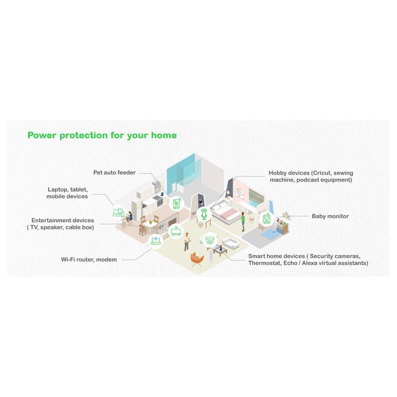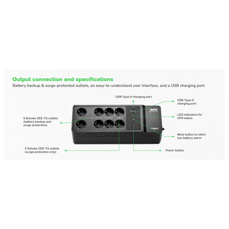 "APC Back-UPS, 1050VA/600W Floor/Wall Mount, 230V, 8x Schuko CEE 7/3 outlets, USB Type A+C Port, User Replaceable Battery. UPS topology: Standby (Offline), Output power capacity: 1.05 kVA, Output power: 600 W. AC outlet types: CEE. Battery technology: Lead-Acid, Battery capacity: 9 Ah, Battery voltage: 12 V. Form factor: Desktop, Product colour: Black. Compliance certificates: CE, EAC"\n"This APC Back-UPS offers power and surge protection for wireless networks, computers, gaming consoles and other electronics in your home or business. The 1050VA floor/wall mount UPS has 8 total outlets, 6 of which are battery back up and surge protection, and 2 that are surge protection only. It has a surge energy rating of 310 Joules. It has 2 USB Ports (Type A + C) for smart charging of personal devices. This UPS has a 2-year warranty on unit and battery. 3-year warranty, €100,000 lifetime connected equipment protection policy, and free technical support exclusive for European community countries only. It is compatible with a dedicated user-replaceable battery, and the APC replacement battery cartridge helps restore UPS performance to the original specifications."