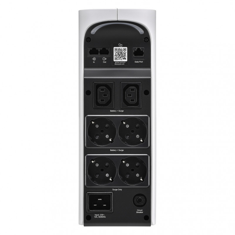 "APC Back-UPS Pro, 2200VA/1320W, Tower, 230V, 4x Schuko and 2x IEC C13 outlets, RGB Lights, Pure Sine Wave, Arctic (White). UPS topology: Line-Interactive, Output power capacity: 2.2 kVA, Output power: 1320 W. AC outlet types: C13 coupler, AC outlets quantity: 6 AC outlet(s), Serial interface type: RJ-45. Battery technology: Sealed Lead Acid (VRLA), Battery voltage: 24 V, Battery life (max): 5 year(s). Form factor: Tower, Product colour: White, Rack capacity: 0U. Certification: IEC 62040-1-1 IEC 62040-2"\n"This APC Back-UPS Pro offers premium power protection for high performance gaming consoles and PC, routers/modems, and gaming accessories. The 2200VA/1320W tower UPS has 6 total outlets, 3 of which are battery back up and surge protection, and 3 that are surge protection only. It has a surge energy rating of 1080 Joules. It features Automatic Voltage Regulation to correct voltage dips and surges to proper levels. It comes with PowerChute Serial Shutdown, an easy-to-use safe system shutdown software with power and energy management features. This UPS has a 3-year warranty and a $150,000 connected equipment protection policy. It has 2 USB ports (Type A + C) for smart charging of personal devices."
