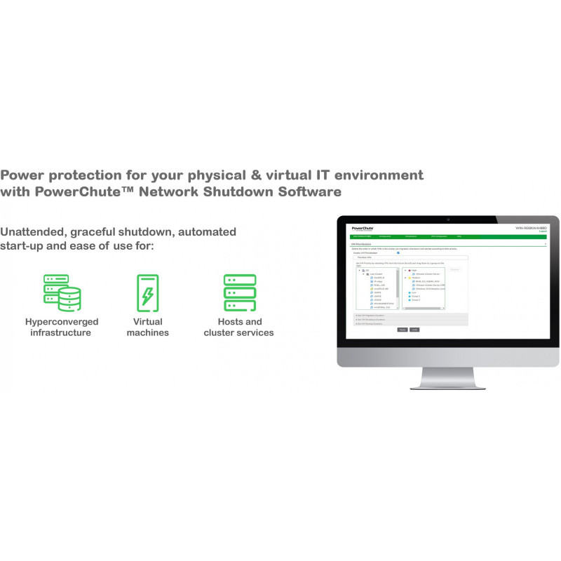 PowerChute Network Shutdown is UPS management software that works with the UPS Network Management Card to protect Windows, Linux and Host ESXi, but also hyperconverged and virtual infrastructure*. In the event of a power failure, PowerChute can shut down your virtual machines correctly and the pre-configured boot sequence ensures that they are turned back on.