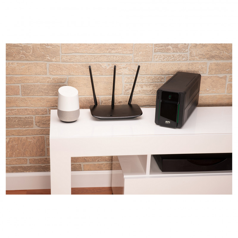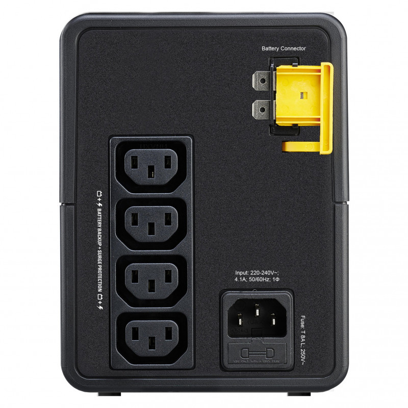 "APC Easy UPS. UPS topology: Line-Interactive, Output power capacity: 0.9 kVA, Output power: 480 W. AC outlet types: C14 coupler, Power plug: C14 coupler, AC outlets quantity: 4 AC outlet(s). Battery technology: Sealed Lead Acid (VRLA). Product colour: Black, Cable length: 1.2 m. Certification: CE"\n"Battery backup and surge protection