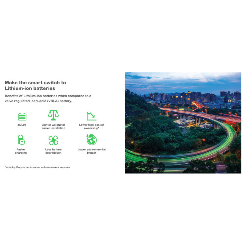 -Smaller and lighter. Li-Ion batteries are smaller and weigh approximately 30% less than lead acid batteries, saving space, 2U form factor and simplifying installation.