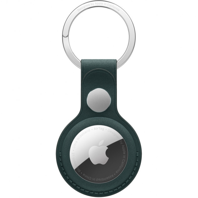"Apple AirTag FineWoven Key Ring - Dark Green. Type: Case, Product colour: Green, Brand compatibility: Apple"\n"The FineWoven key ring is thoughtfully crafted from innovative materials. The stainless steel is as striking as it is strong, while the durable micro-twill has a suede-like feel and is made from 68 per cent post-consumer recycled content, significantly reducing carbon emissions compared to leather. And it fits snugly over your AirTag, so you never have to worry about it falling out. AirTag is sold separately."