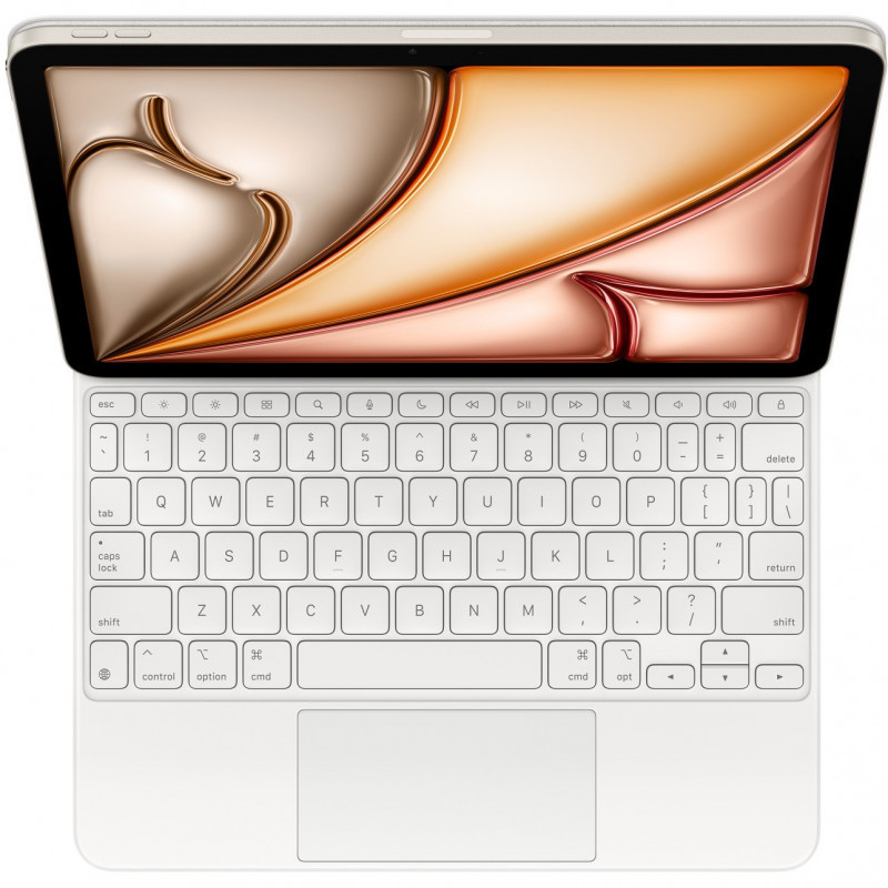 "Apple Magic Keyboard. Keyboard layout: QWERTY, Keyboard language: US English, Pointing device: Trackpad. Brand compatibility: Apple, Compatibility: iPad Air 11-inch (M3) iPad Air 11-inch (M2) iPad Air (5th generation) iPad Air (4th generation), Product colour: White. Package width: 212 mm, Package depth: 271 mm, Package height: 27 mm"\n"Magic Keyboard is the perfect companion for iPad Air. It delivers an amazing typing experience and a trackpad for precision tasks in a sleek, portable design. The keyboard includes a 14‑key function row, a USB‑C connector for pass‑through charging, and front and back protection for your iPad. The floating cantilever design smoothly adjusts to multiple viewing angles and a large glass trackpad expands how you can work with iPadOS."