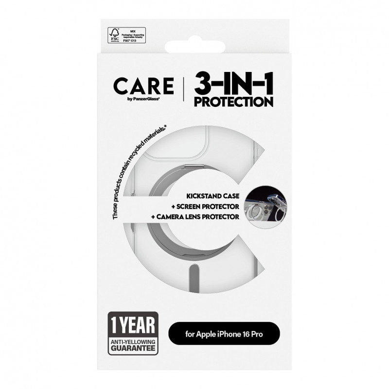 "PanzerGlass CARE™ by ® 3-in-1 Ceramic Bundle iPhone 16 Pro. Brand compatibility: Apple, Compatibility: Apple - iPhone 16 Pro. Dry application. Protection features: Scratch resistant, Shock resistant. Material: Thermoplastic polyurethane (TPU), Tempered glass, Polyethylene terephthalate (PET), Silicone, Product colour: Transparent. Quantity per pack: 1 pc(s)"\n"Upgrade your phone's protection with the CARE by PanzerGlass® 3-in-1 Feature Bundle, designed for those who demand premium quality for their device. This bundle includes a Ceramic Screen Protector and Ceramic Hoops® camera lens protector by PanzerGlass®, and a Transparent Kickstand Case from CARE by PanzerGlass®. Together, they ensure your device stays safe while maintaining a premium look and feel that complements your style.