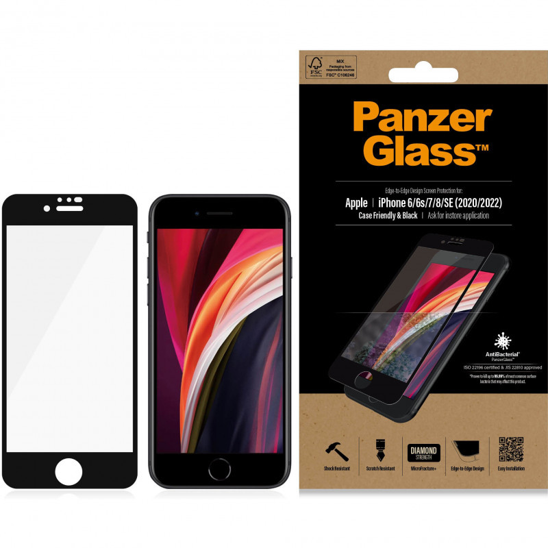 "PanzerGlass ® Screen Protector iPhone 8 | 7 | 6s | 6 | SE (2020/2022) | Edge-to-Edge. Brand compatibility: Apple, Compatibility: Apple - iPhone 6, Apple - iPhone 6s, Apple - iPhone 7, Apple - iPhone 8, Apple - iPhone SE 2020,.... Dry application. Protection features: Scratch resistant, Shock resistant, Anti-bacterial. Material: Tempered glass, Polyethylene terephthalate (PET), Silicone, Product colour: Transparent. Quantity per pack: 1 pc(s)"\n"Protect your phone from the hazards of everyday life with PanzerGlass®. Accidental bumps against sharp-edged dangers in your pocket or crushing falls onto stone-hard pavements are no match for this scratch and shock-resistant screen protector. It even has a smudge-free coating with antibacterial effect that reduces traces of fingerprints and kills up to 99.99% of all common surface bacteria. The screen protector is easy to apply and once installed, you’ll never again fear the sight of your phone tumbling to the ground. This may never happen, but if it does, you’ll regret not having clicked “add to cart”.