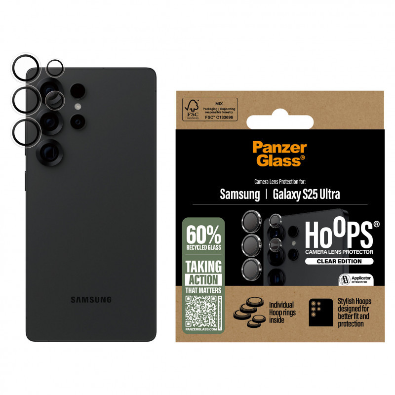 "PanzerGlass ® Hoops® Camera Lens Protector Transparent Samsung Galaxy S25 Ultra. Brand compatibility: Samsung, Compatibility: Samsung - Galaxy S25 Ultra. Dry application. Protection features: Scratch resistant, Shock resistant. Material: Tempered glass, Silicone, Product colour: Transparent. Quantity per pack: 1 pc(s)"\n"No ”Oops!” with Hoops®! The PanzerGlass® Hoops® Camera Lens Protector keeps your camera lenses safe from accidental drops on stone-hard floors, bumps against sharp corners, and the screeching kiss of keys in your pocket. These Hoops® feature a clear frame that allow your phone's color to shine through, enhancing its natural look. The slim profile optic rings are equipped with scratch-and shock-resistant glass and a metal frame that protect your lenses as well as looking great. And if you’re worried about image distortion, you can rest easy: Hoops® don’t affect the clarity of your lenses or the quality of your photos – they just give you a bit more peace of mind.