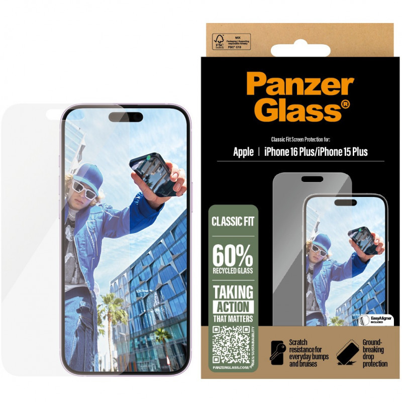 "PanzerGlass ® Screen Protector iPhone 16 Plus | 15 Plus | Classic Fit. Brand compatibility: Apple, Compatibility: Apple - iPhone 16 Plus. Dry application. Protection features: Scratch resistant, Shock resistant. Material: Tempered glass, Polyethylene terephthalate (PET), Silicone, Product colour: Transparent. Quantity per pack: 1 pc(s)"\n"Want to protect your phone screen from the hazards of everyday life? Then this scratch, shock and drop-resistant PanzerGlass® screen protector is your knight in shining armor. It’s made of 60% recycled glass and will shield your phone screen from accidental bumps against sharp-edged dangers and crushing falls onto stone-hard pavements. And to top it all off, it has a smudge-free coating that reduces traces of fingerprints and grease to give you a clear screen view. The enclosed EasyAligner made of 100% recycled plastic makes installation a piece of cake (seriously!). To make it even easier, we’ve included step-by-step instructions as well as a QR code for quick access to our online how-to video. And remember: Once installed, you’ll never again fear your phone falling screen-first. This might not happen, but then again … it might! This screen protection prolongs the lifetime of your phone so that one day you can pass it on to someone else who will love it just as much as you do. It’s the new circle of phone life and one way of working toward a more sustainable future. Another is to use less packaging: In 2024, we reduced the amount of paper in our PanzerGlass® core product packaging design by an average of 66 %*. So, of course, this product comes in a recyclable FSC™-certified box. The screen protector is Classic Fit, meaning it covers the active part of your screen. For extra phone protection, combine the screen protection with a PanzerGlass® protective case, for example, a fearlessly fashionable case from CARE by PanzerGlass®, and a PanzerGlass® PicturePerfect or Hoops® camera lens protector. *Reduction from 2022-2024 measured by comparing selected products from the PanzerGlass® core range."