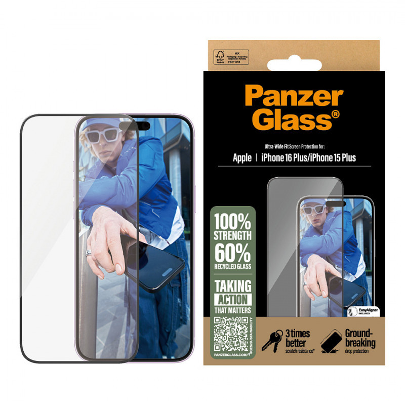 "PanzerGlass ® Screen Protector iPhone 16 Plus | 15 Plus | Ultra-Wide Fit. Brand compatibility: Apple, Compatibility: Apple - iPhone 16 Plus, Apple - iPhone 15 Plus. Dry application. Protection features: Scratch resistant, Shock resistant. Material: Tempered glass, Polyethylene terephthalate (PET), Silicone, Product colour: Transparent. Quantity per pack: 1 pc(s)"\n"60% recycled glass. 100% strength. 100% original. With high-level scratch resistance, impressive shock-resistance capabilities, and groundbreaking drop protection, this PanzerGlass® screen protector shields your phone screen from accidental bumps, crushing falls, and other hazards of everyday life. It’s made of almost two-thirds recycled glass and even has a smudge-free coating that reduces traces of fingerprints and grease to provide you with a clear screen view. With the enclosed EasyAligner made of 100% recycled plastic, installation is a piece of cake (seriously!). To make it even easier, we’ve included step-by-step instructions as well as a QR code for quick access to our online how-to video. And remember: Once installed, you’ll never again fear your phone falling screen-first. This might not happen, but then again … it might! This screen protection prolongs the lifetime of your phone so that one day you can pass it on to someone else who will love it just as much as you do. It’s the new circle of phone life and one way of working toward a more sustainable future. Another is to use less packaging. In 2024, we reduced the amount of paper in our PanzerGlass® core product packaging design by an average of 66%*. So, of course, this product comes in a recyclable FSC™-certified box. The screen protector is Ultra-Wide Fit. This means it covers the front surface of your phone, providing a complete view of your screen while leaving a little room around the edges for a PanzerGlass® case, for example, a fearlessly fashionable case from CARE by PanzerGlass®. And if you’re thinking: “What if my camera lenses get scratched?” Well, help is just a few clicks away: Combine your screen protector and case with PanzerGlass® PicturePerfect or Hoops®. *Reduction from 2022-2024 measured by comparing selected products from the PanzerGlass® core range."