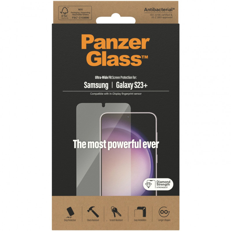 "PanzerGlass ® Screen Protector Samsung Galaxy S23+ | Ultra-Wide Fit. Brand compatibility: Samsung, Compatibility: Samsung - Galaxy S23+. Dry application. Protection features: Scratch resistant, Shock resistant, Anti-bacterial. Material: Tempered glass, Polyethylene terephthalate (PET), Silicone, Product colour: Transparent. Quantity per pack: 1 pc(s)"\n"Protect your Samsung from the hazards of everyday life with a PanzerGlass® screen protector. Accidental bumps against sharp-edged dangers in your pocket or crushing falls onto stone-hard pavements are no match for this scratch and shock-resistant screen protector, which provides high-level drop protection. It even has a smudge-free coating with antibacterial effect that reduces traces of fingerprints and kills up to 99.99% of all common surface bacteria. And if you’re worried about fingerprint readability, you can rest easy: The screen protector ensures 100% compatibility with your screen’s ultrasonic fingerprint reader, so you can be sure that your phone unlocks smoothly every time.
