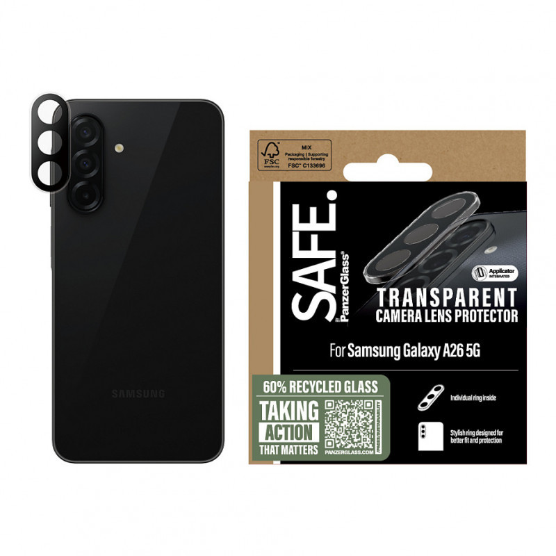 "PanzerGlass SAFE. by ® Camera Lens Protector Transparent Samsung Galaxy A26 5G. Brand compatibility: Samsung, Compatibility: Samsung - Galaxy A26 5G. Dry application. Protection features: Scratch resistant, Shock resistant. Material: Silicone, Tempered glass, Product colour: Transparent. Quantity per pack: 1 pc(s)"\n"It’s your life. It’s your choice. It’s your moment. With this camera lens protector from SAFE. by PanzerGlass® you can capture all the beautiful moments of your life without worrying about dance floor mishaps, selfies gone wrong or posting catastrophes scratching your camera lenses. The slim profile optic rings even look great on your phone! Like a cool design accessory! And if you’re worried about image distortion, rest easy: The camera lens protector doesn’t affect the quality of your photos in ANY way – it just gives you a bit more peace of mind. Can you feel it? Love is in the air. Love for phones and the planet. It’s the new circle of phone life. When you keep your camera lenses SAFE., you prolong the lifetime of your beloved phone so that you can one day pass it on to another phone lover who will love it just as much as you do. Choose SAFE. and give your phone a second, third or fourth life! This is one way of working toward a more sustainable future! Another is to use more sustainable packaging. So, of course, this product comes in a recyclable FSC™-certified box. Everybody deserves to be SAFE. Without hassle, red tape, or unnecessary complexity. This camera lens protector is equipped with a silicone adhesive along the edges and comes with an easy-to-use applicator that makes installation so simple you can do it even if you’re all thumbs! And remember: Once you’re done, you’ll never again fear the sight of your phone tumbling to the ground camera first. This may not happen, but if it does, you’ll regret not having clicked “add to cart”. Keep your phone SAFE."