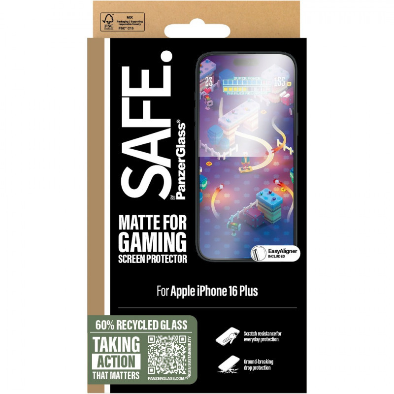 "PanzerGlass SAFE. by ® Gaming Screen Protector iPhone 16 Plus | 15 Plus | Ultra-Wide Fit. Brand compatibility: Apple, Compatibility: Apple - iPhone 16 Plus, Apple - iPhone 15 Plus. Dry application. Protection features: Scratch resistant, Shock resistant. Material: Tempered glass, Polyethylene terephthalate (PET), Silicone, Product colour: Transparent. Quantity per pack: 1 pc(s)"\n"Game on! Screen protection on! Let’s play! This SAFE. by PanzerGlass® screen protector with matte surface will fight off tarmac terrors, cobblestone monsters, and other screen-scratching bad guys, while you battle your way to the top of the high score list! Enjoy high touch sensitivity, a smooth surface and impressive scratch resistance that will take your game and screen protection to the next level! And to top it all off, the screen protector is made of 60% recycled glass and even has a smudge-free coating that reduces traces of fingerprints and grease. Can you feel it? Love is in the air. Love for phones and the planet. It’s the new circle of phone life. When you keep your beloved phone SAFE., you can one day pass it on to another phone lover who will adore it just as much as you do. Choose SAFE. and give your phone new life! This is one way of working toward a more sustainable future! Another is to use more sustainable packaging. So, of course, this product comes in a recyclable FSC™-certified box. Everybody deserves to be SAFE. Without hassle, red tape, or unnecessary complexity. This screen protector comes with an EasyAligner made of 100% recycled plastic that makes installation a piece of cake (seriously!). We’ve even included step-by-step instructions as well as a QR code for quick access to our online how-to video. And remember: Once installed, you’ll never again fear your phone falling screen-first. So, what are you waiting for? No screen protection is worth poor screen performance! That’s why this screen protector has an Ultra-Wide Fit, meaning it covers the front surface of your phone, providing a complete and crystal-clear view of your screen. It even leaves a little room around the edges for a SAFE. by PanzerGlass® case or a cool, colorful case from CARE by PanzerGlass®. And if you want to be extra SAFE., combine the screen protector and case with a SAFE. by PanzerGlass® camera lens protector. Keep your phone SAFE."