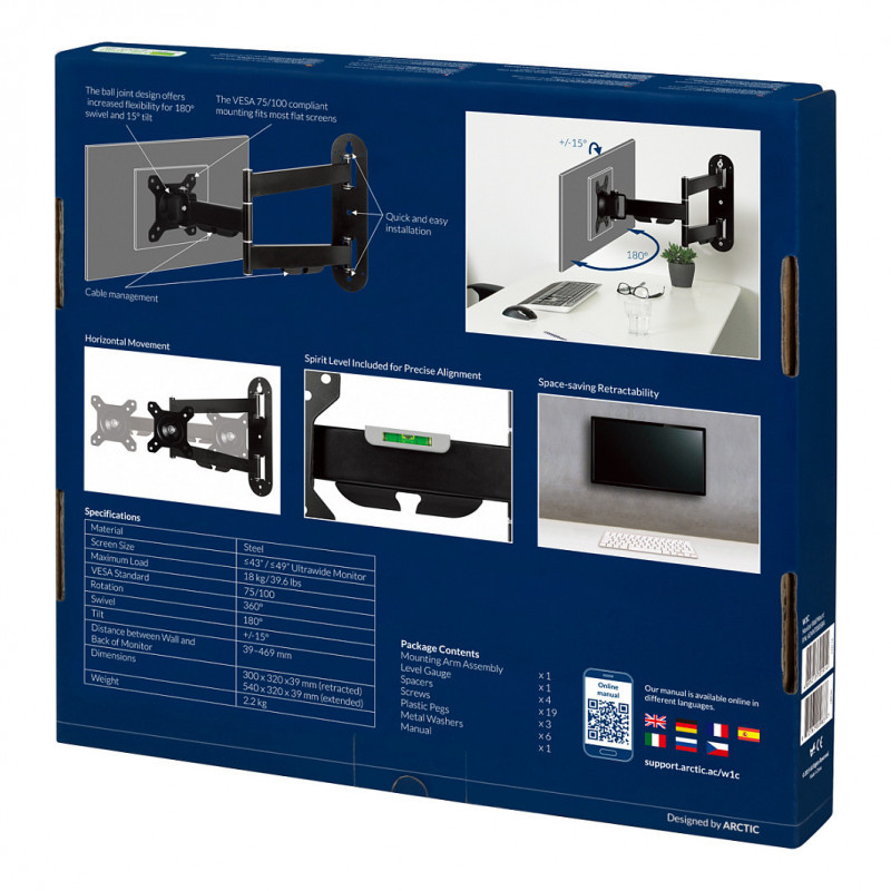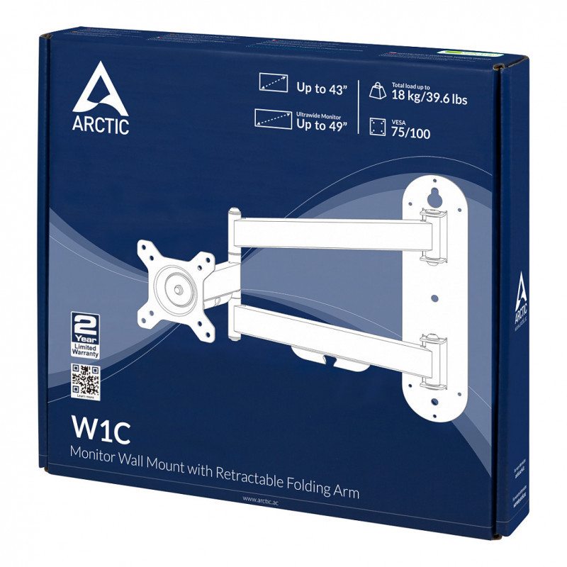 "ARCTIC W1C - Wall Mount with Retractable Folding Arm. Maximum weight capacity: 18 kg, Maximum screen size: 124.5 cm (49""), Minimum VESA mount: 75 x 75 mm, Maximum VESA mount: 100 x 100 mm. Tilt angle range: -15 - 15°. Product colour: Black"\n"The W1C monitor mount now gives you more room on your desk. Wall mounting your screen is a practical choice that keeps your entire work surface free of cables, monitor mounts and monitor stands. Your monitor can be quickly and safely attached to the mounting head while still remaining flexible in its orientation. Later changes in the adjustment of your monitor can be done easily: no matter if rotating, swiveling or tilting, with the W1C you will always find the optimal setting. Even your modern Ultrawide monitor, with a screen diagonal of up to 49 inches, is no problem for the W1C wall mount, while classic 16:9 monitors are compatible up to a screen diagonal of 43 inches. Whether classic or ultrawide, the W1C supports monitors up to a weight of 18 kg/39.6 lbs."