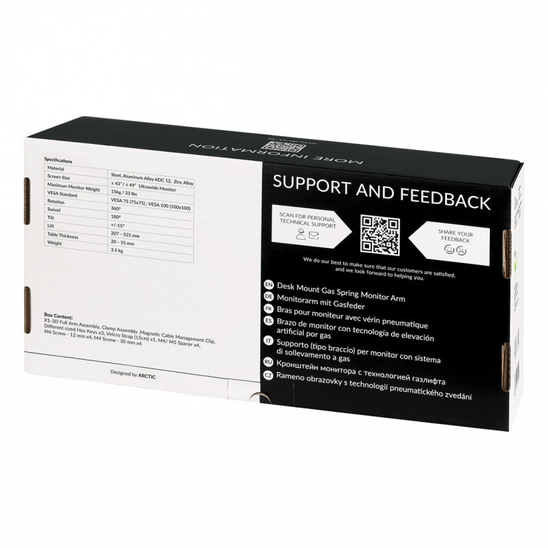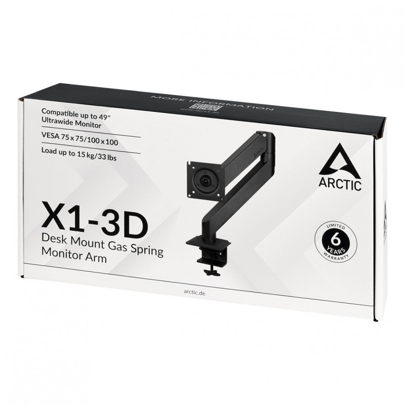 "ARCTIC X1-3D - Desk Mount Gas Spring Monitor Arm. Mounting: Clamp, Maximum weight capacity: 10 kg, Maximum screen size: 109.2 cm (43""), Minimum VESA mount: 75 x 75 mm, Maximum VESA mount: 100 x 100 mm. Height adjustment, Tilt angle range: -15 - 15°. Product colour: Black"\n