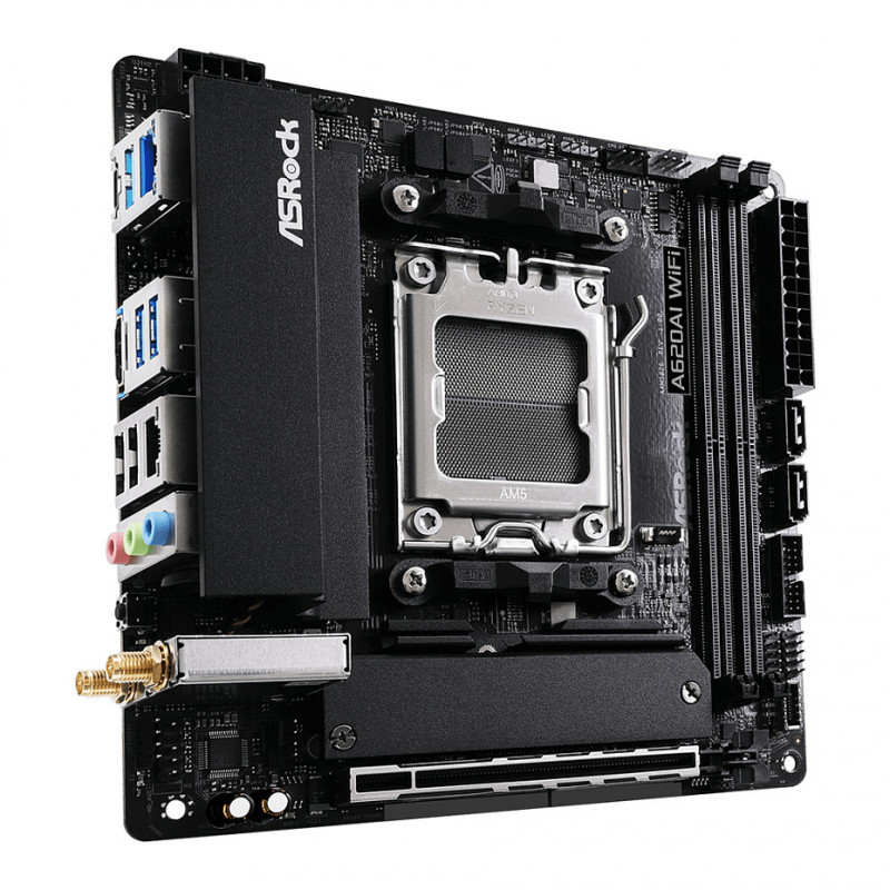 "Asrock A620AI WiFi. Processor manufacturer: AMD, Processor socket: Socket AM5, Compatible processor series: AMD Ryzen 7000 Series, AMD Ryzen 8000 Series, AMD Ryzen 9000 Series. Supported memory types: DDR5-SDRAM, Maximum internal memory: 128 GB, Memory slots type: DIMM. Supported storage drive interfaces: M.2, SATA III, Supported storage drive types: HDD & SSD. Ethernet interface type: 2.5 Gigabit Ethernet, LAN controller: Dragon RTL8125BG, Top Wi-Fi standard: Wi-Fi 6E (802.11ax). Component for: PC, Motherboard form factor: mini ITX, Motherboard chipset family: AMD"\n"8 Layer PCB