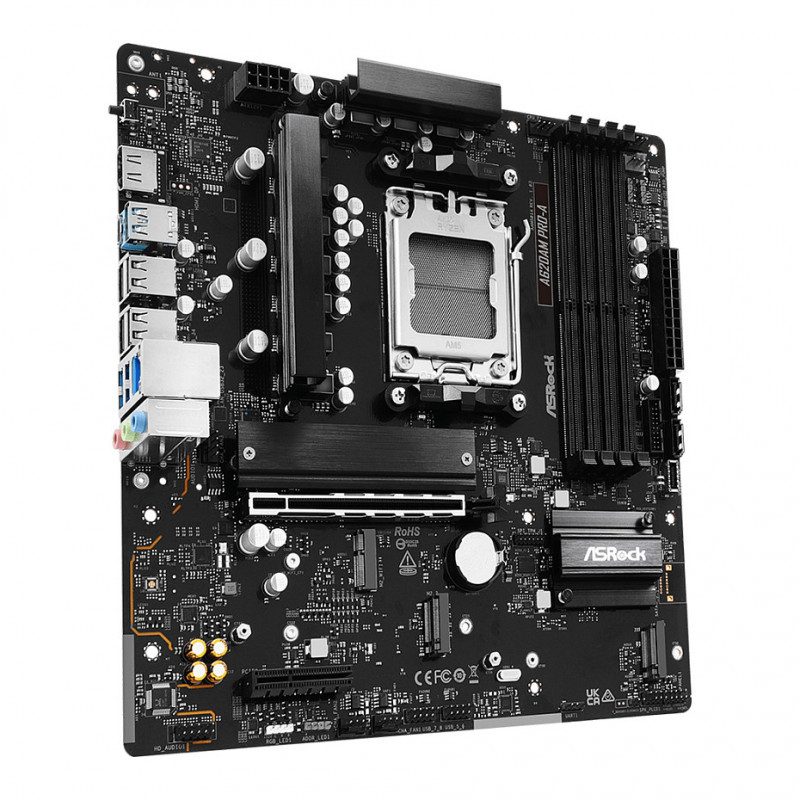 "Asrock A620AM PRO-A. Processor manufacturer: AMD, Processor socket: Socket AM5, Compatible processor series: AMD Ryzen 7000 Series, AMD Ryzen 8000 Series, AMD Ryzen 9000 Series. Supported memory types: DDR5-SDRAM, Maximum internal memory: 256 GB, Memory slots type: DIMM. Supported storage drive interfaces: M.2, NVMe, SATA III, Supported storage drive types: HDD & SSD, RAID levels: 0, 1, 10. Graphics card family: AMD, Graphics card: AMD RDNA 2, Maximum resolution: 3840 x 2160 pixels. Ethernet interface type: 2.5 Gigabit Ethernet, Fast Ethernet, Gigabit Ethernet, LAN controller: Dragon RTL8125BG"\n"Optimized for stability, durability, and efficiency. It combines reliable performance, user-friendly features and streamlined style for daily computing tasks.