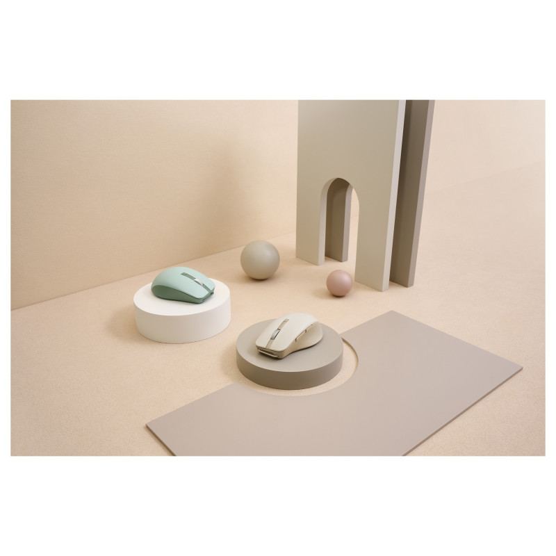 "ASUS SmartO Mouse MD200 Silent Plus. Form factor: Ambidextrous. Movement detection technology: Optical, Device interface: RF Wireless + Bluetooth, Movement resolution: 4200 DPI, Buttons quantity: 6, Scroll type: Wheel. Power source: Batteries. Product colour: Beige"\n"Portable, Precise, and Quiet