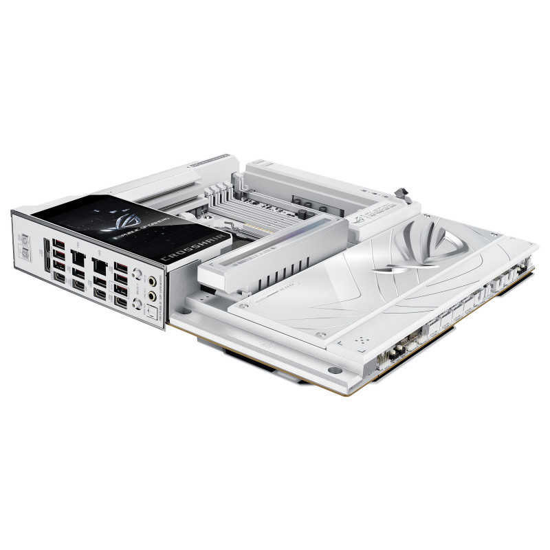 "ASUS ROG CROSSHAIR X870E GLACIAL. Processor manufacturer: AMD, Processor socket: Socket AM5, Compatible processor series: AMD Ryzen 7000 Series, AMD Ryzen 8000 Series, AMD Ryzen 9000 Series. Supported memory types: DDR5-SDRAM, Maximum internal memory: 256 GB, Memory slots type: DIMM. Supported storage drive interfaces: M.2, SATA III, Supported storage drive types: HDD & SSD, RAID levels: 0, 1, 5, 10. Ethernet interface type: 10 Gigabit Ethernet, Top Wi-Fi standard: Wi-Fi 7 (802.11be), Wi-Fi standards: Wi-Fi 7 (802.11be). Component for: PC, Motherboard form factor: Extended ATX, Motherboard chipset family: AMD"\n"The ROG X870E Glacial is a flagship motherboard engineered for uncompromising performance and sophisticated AI. It boasts a robust 24+2+2 power stage design, Dynamic OC Switcher, and Core Flex for next-generation overclocking control. Meanwhile, advanced memory tuning is unlocked through server-grade DRAM enhancement and NitroPath DRAM technology, and storage scales with support for up to seven M.2 drives. Top-tier connectivity includes two 10G Ethernet ports, two USB4® ports, and two USB 20Gbps Type-C® front-panel connectors. This motherboard also features a 3D VC M.2 heatsink and a 5-inch LCD display, along with AI Cache Boost and AI Advisor for smarter, more intuitive system tuning.