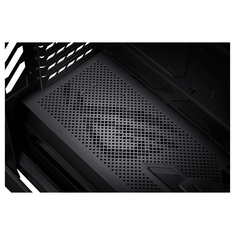 Last but not least, the shroud for your power supply unit features an open section for PSUs like the ROG Thor, which features a special OLED panel that displays your current watt consumption. The mesh topping the shroud is also shaped to reveal another subtle ROG logo, while being designed to prevent screws from falling within."