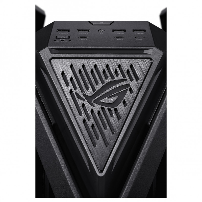 A front side air intake can provide ample ventilation to get just the right balance of temperatures for your system and graphics cards. This integrates tightly into a bold new look with features like the distinctive diamond-shaped badge on the front, stamped with the famous ROG logo and surrounded by diagonal slashes.