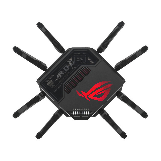 "ASUS ROG Rapture GT-BE98. Wi-Fi band: Quad-band (2.4 GHz / 5 GHz-1 / 5 GHz-2 / 6 GHz), Top Wi-Fi standard: Wi-Fi 7 (802.11be), WLAN data transfer rate (max): 11529 Mbit/s. Ethernet LAN interface type: 10 Gigabit Ethernet, Ethernet LAN data rates: 10,100,1000,2500,10000 Mbit/s, VPN support: VPN Client L2TP VPN Client Open VPN VPN Client PPTP VPN Client WireGuard VPN Server IPSec VPN.... Security algorithms: SSH, WPA-Enterprise, WPA-PSK, WPA2-Enterprise, WPA2-PSK, WPA3-Enterprise, WPA3-PSK, WPS. Product type: Tabletop router, Product colour: Black, LED indicators: LAN, Power, WAN. Cables included: LAN (RJ-45)"\n"ROG Rapture GT-BE98