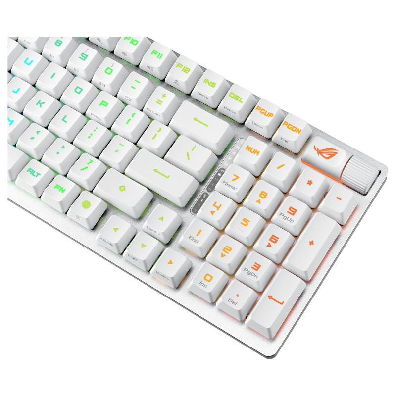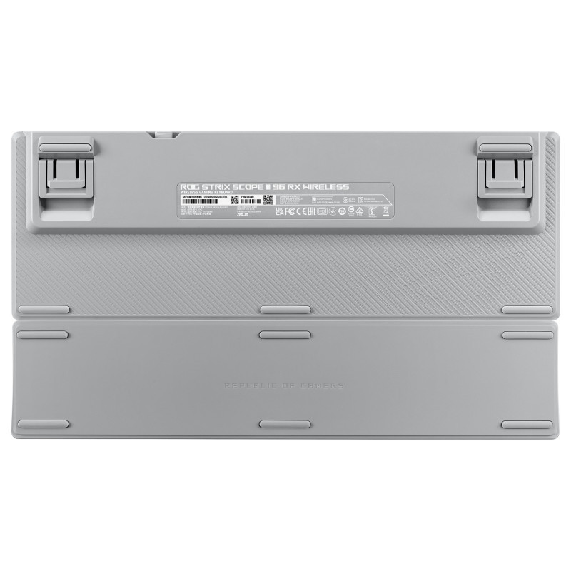 "ASUS ROG Strix Scope II 96 RX Wireless. Keyboard form factor: 96%. Keyboard style: Straight. Connectivity technology: Wired & Wireless, Device interface: USB + RF Wireless + Bluetooth, Keyboard key switch: Optical key switch. Backlight type: RGB LED, Wrist rest. Cable length: 2 m. Recommended usage: Gaming. Product colour: White"\n"LIGHTSPEED GAMING VERSATILITY