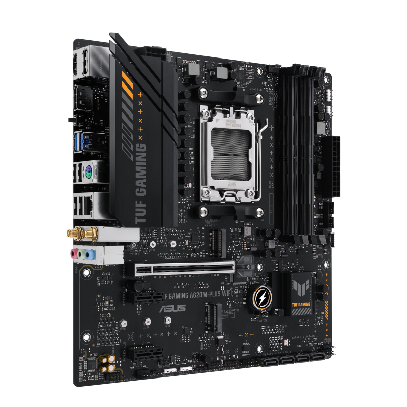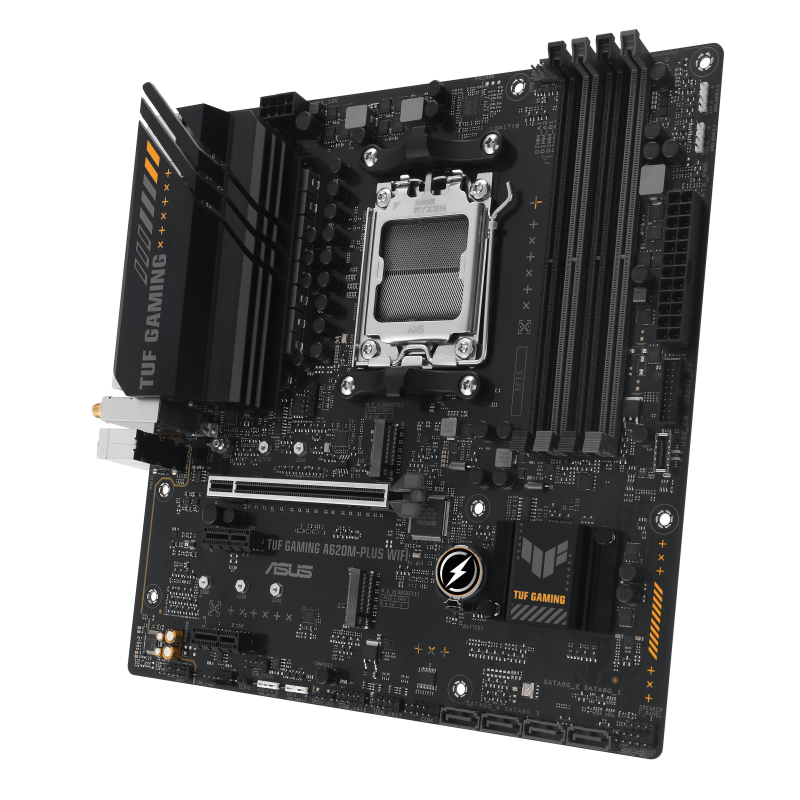 Asus | TUF GAMING A620M-PLUS WIFI | Processor family AMD | Processor socket AM5 | DDR5 DIMM | Memory slots 4 | Supported hard disk drive interfaces SATA, M.2 | Number of SATA connectors 4 | Chipset AMD A620 | Micro-ATX
