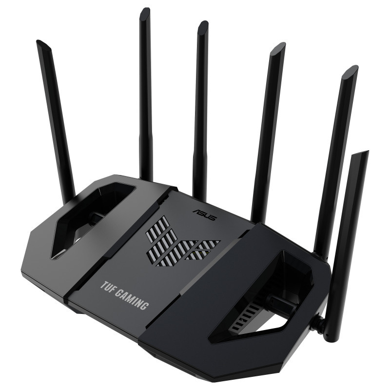 "ASUS TUF Gaming BE6500 (TUF-BE6500). WAN connection type: RJ-45. Wi-Fi band: Dual-band (2.4 GHz / 5 GHz), Top Wi-Fi standard: Wi-Fi 7 (802.11be), WLAN data transfer rate (max): 6500 Mbit/s. Ethernet LAN interface type: 2.5 Gigabit Ethernet, VPN support: Instant Guard VPN Client L2TP VPN Client Open VPN VPN Client PPTP VPN Client WireGuard VPN Server.... Security algorithms: WPA-Enterprise, WPA-PSK2, WPA2-Enterprise, WPA2-Personal, WPA3-Enterprise, WPA3-Personal, WPS, Firewall security: Maximum Firewall Keyword Filter : 64 • Maximum Firewall Network Service Filter : 32 • Maximum.... Product type: Tabletop router, Product colour: Black, LED indicators: LAN, Power, WAN"\n"Inspired by the unique design and power wings of drones, the TUF Gaming BE6500 combines a sleek appearance with advanced cooling efficiency. Its hollow design on both sides enhances heat dissipation for stable all-day operation, enhancing your internet and gaming experience.