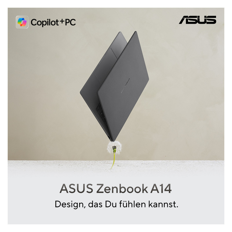 "ASUS Zenbook A14 UX3407RA-QD011W Copilot+ PC. Product type: Laptop, Form factor: Clamshell. Processor family: Qualcomm Snapdragon, Processor model: X1E-78-100. Display diagonal: 35.6 cm (14""), HD type: WUXGA, Display resolution: 1920 x 1200 pixels. Internal memory: 32 GB, Internal memory type: LPDDR5x-SDRAM. Total storage capacity: 1 TB, Storage media: SSD. On-board graphics card model: Qualcomm Adreno GPU. Operating system installed: Windows 11 Home. Product colour: Grey. Weight: 980 g"\n"Unload. Unplugged. Unlimited.