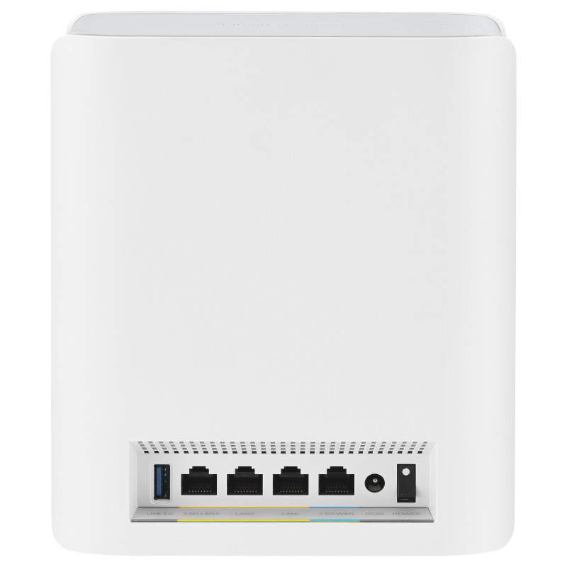 "ASUS ZenWiFi BT8. Product colour: White, Antenna type: Internal, Product type: Mesh router. Wi-Fi band: Tri-band (2.4 GHz / 5 GHz / 6 GHz), Top Wi-Fi standard: Wi-Fi 7 (802.11be), WLAN data transfer rate (max): 8643 Mbit/s. Internal memory: 1000 MB, Flash memory: 128 MB, Firewall security: Firewall. AC input voltage: 110 - 240 V, AC input frequency: 50 - 60 Hz, AC adapter output voltage: 12 V. Width: 159 mm, Depth: 72 mm, Height: 186 mm"\n"ASUS ZenWiFi BT8 Worry-Free Smart Home Mesh