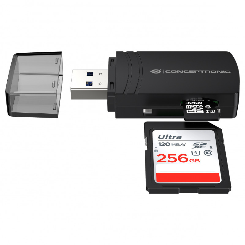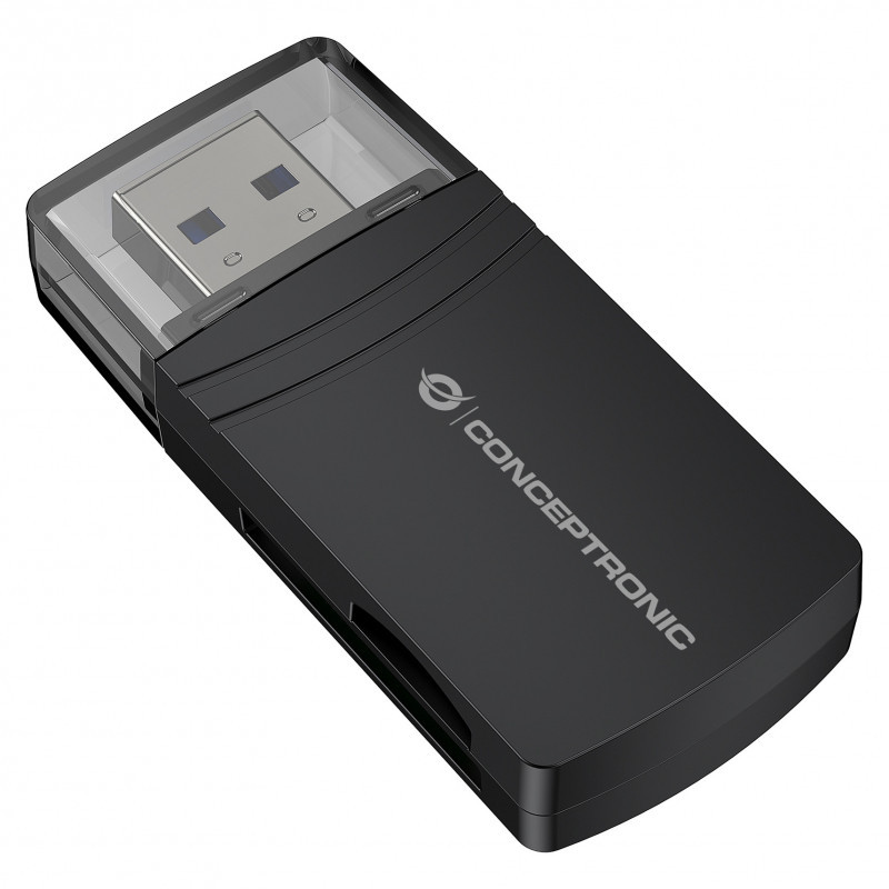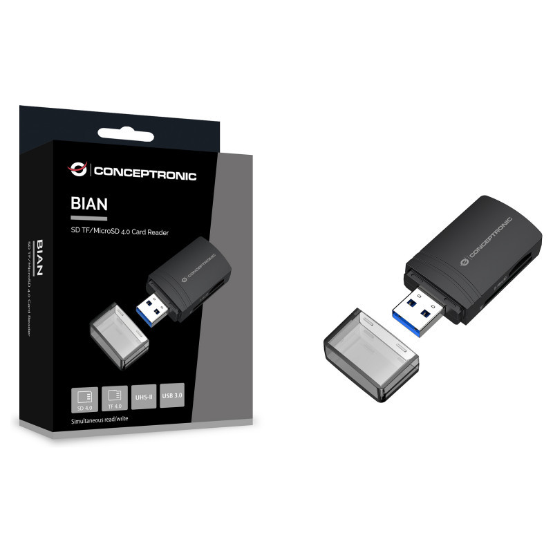 "Conceptronic BIAN06B SD TF/MicroSD 4.0 Card Reader, UHS-II, USB 3.0, 5Gbps. Compatible memory cards: MicroSD (TransFlash), MicroSDHC, MicroSDXC, SD, SDHC, SDXC, Product colour: Black, Data transfer rate: 5000 Mbit/s. Interface: USB 3.2 Gen 1 (3.1 Gen 1) Type-A. Width: 26.5 mm, Depth: 10.5 mm, Height: 57.5 mm. Package width: 75 mm, Package depth: 25 mm, Package height: 95 mm. Windows operating systems supported: Windows 11 Enterprise x64, Windows 10, Windows 11 Home, Windows 10 Education, Windows 11 Pro,..., Mac operating systems supported: Mac OS X 10.14 Mojave, Mac OS X 10.7 Lion, Mac OS X 10.15 Catalina, Mac OS X 10.7.5 Lion, Mac OS X..., Mobile operating systems supported: Android 7.1.2, Android 8.0, Android 8.1, Android 10.0, Android 9.0, Android 11.0, Android 12.0,..."\n"The SD/TF 4.0 Card Reader ensures steady and efficient data transmission, supporting SD/TF 4.0 and UHS-II with USB 3.0 transfer speeds up to 5Gbps. It also allows simultaneous reading and writing of two cards. As a USB-powered device, no external power is needed, making it an ideal companion for travel or everyday use."