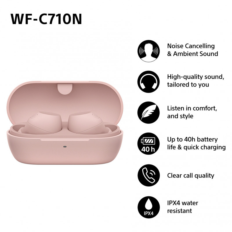"Sony U.K. WFC710NP.CE7. Product type: Headset. Connectivity technology: True Wireless Stereo (TWS), Bluetooth. Recommended usage: Music/Everyday. Headphone frequency: 20 - 20000 Hz. Weight: 48.4 g. Product colour: Pink"\n"Introducing the Sony WF-C710N Noise Cancelling Truly Wireless Earbuds.