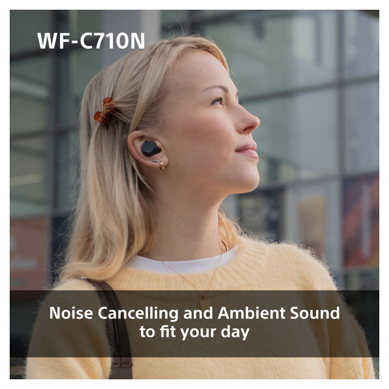 Turn off your surroundings and immerse yourself in music with the WF-C710N. Each earbud is equipped with two microphones that detect and cancel unwanted noise from both inside and outside the earbud, delivering an effective noise cancelling experience. Alternatively, Ambient Sound Mode lets you stay connected to your surroundings, offering a transparent listening experience that keeps you aware of your environment while still enjoying your music. So, whether you're at the gym, a café, or on your way to work, the WF-C710N lets you focus on what matters.