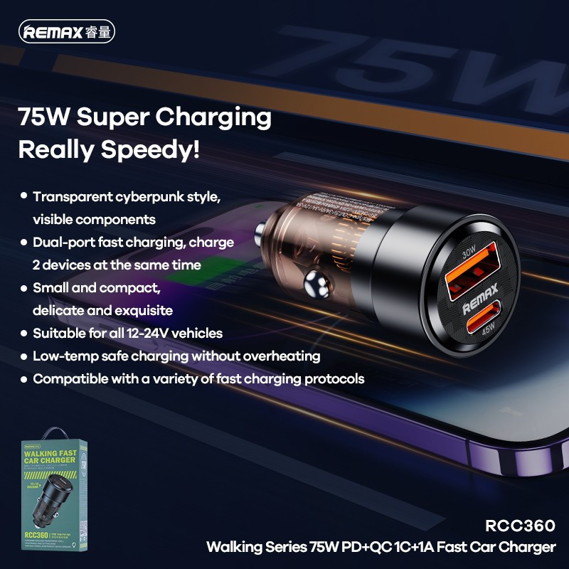 Automobilinis įkroviklis Remax RCC360 75W USB-C/USB-A juodas