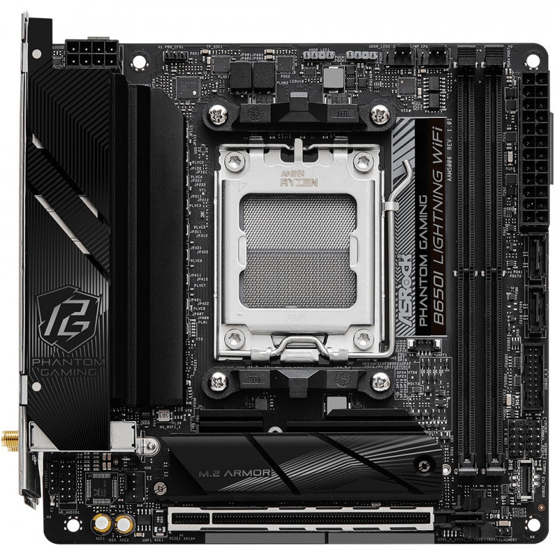 "Asrock B650I Lightning WiFi. Processor manufacturer: AMD, Processor socket: Socket AM5, Compatible processor series: AMD Ryzen 7000 Series. Supported memory types: DDR5-SDRAM, Maximum internal memory: 96 GB, Memory slots type: DIMM. Supported storage drive interfaces: M.2, SATA III, Supported storage drive types: HDD & SSD, RAID levels: 0, 1, 10. Graphics card family: AMD, Graphics card: AMD RDNA 2, Maximum resolution: 3840 x 2160 pixels. Ethernet interface type: 2.5 Gigabit Ethernet, LAN controller: Dragon RTL8125BG, Top Wi-Fi standard: Wi-Fi 6E (802.11ax)"\n"Optimized VRM Design