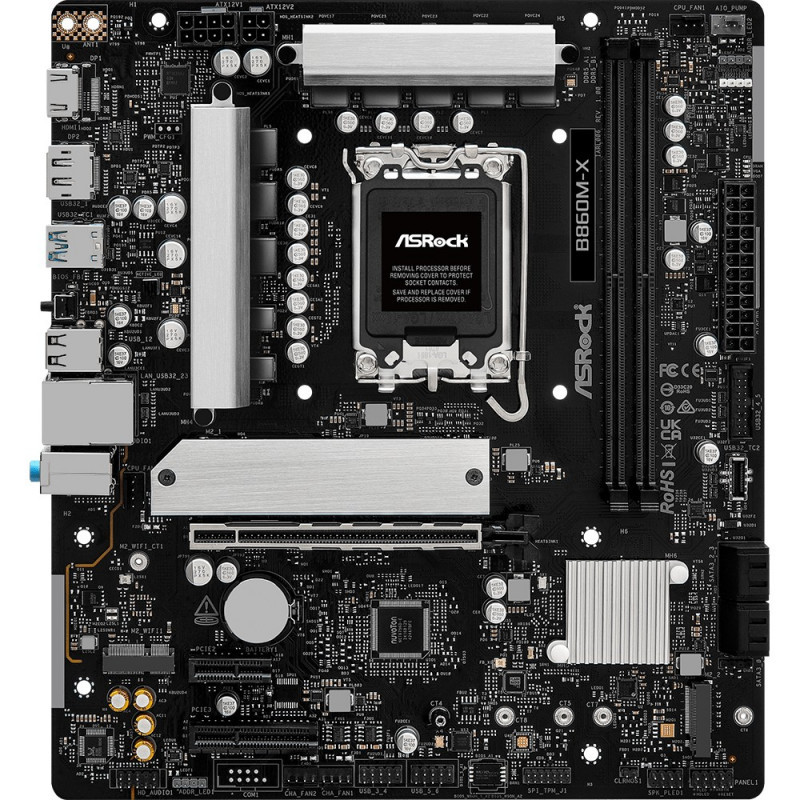 "Asrock B860M-X. Processor manufacturer: Intel, Processor socket: LGA 1851 (Socket V1), Compatible processor series: Intel Core Ultra (Series 2). Supported memory types: DDR5-SDRAM, Maximum internal memory: 128 GB, Memory slots type: DIMM. Supported storage drive interfaces: M.2, SATA III, Supported storage drive types: HDD & SSD, RAID levels: 0, 1, 5, 10. Ethernet interface type: 2.5 Gigabit Ethernet, LAN controller: Dragon RTL8125BG. Component for: PC, Motherboard form factor: micro ATX, Motherboard chipset family: Intel"\n"X Series motherboard offers a compact, high-value solution, balancing performance, versatility, and reliability for both professional and daily tasks.